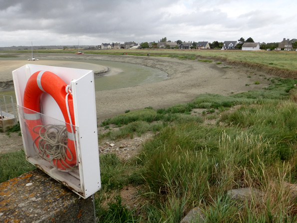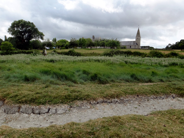 Nous commençons par profiter du soleil revenu pour un temps, malgré le vent force 7, pour pique-niquer sur l’herbe derrière la petite église, face au havre où les prés salés excitent quelques moutons. La mer recouvre l’herbe aux grandes marées trois ou quatre fois l’an. Le guide a apporté de Bretagne de la terrine de cousin (le sien) et de la tomme de brebis bretonne bio de gens qu’il connait. Pour lui, la Bretagne imite beaucoup ses voisins pour promouvoir son image : elle crée son whisky, sa bière, son fromage, ses terrines de campagne, ses biscuits – tout ce qui n’existait pas il y a encore un siècle pour cause de pauvreté. Nous avons en outre par personne, du pain, deux tomates et deux abricots, un yaourt, du café en thermos et un carré de chocolat Lindt à la fleur de sel. Il commet cependant une petite erreur à propos du vin. Il a apporté – sur le budget – une bouteille de Chinon rouge mais annonce tout d’abord avec forces excuses que c’est pour sa consommation personnelle et qu’il ne force personne à boire du vin… avant d’en proposer à chacun. Ceux qui hésitaient un peu pour cause de chaleur et de marche ont décliné, alors qu’ils en auraient peut-être pris une lichette avec le fromage.