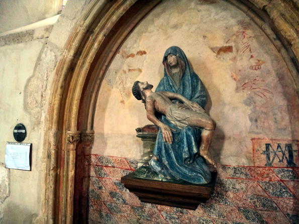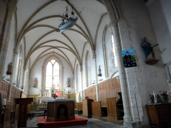 Un autre grain vient et nous nous réfugions dans l’église où pend, au centre de la nef, la maquette ex-voto d’un bateau de guerre à voiles et où trône, à la droite du chœur, une statue de sainte Barbe, patronne des artificiers, canonniers et mineurs de fond. Princesse devenue chrétienne et refusant d’abjurer, Barbe aurait vue, au moment d’être décapitée, ses deux bourreaux la hache déjà levée, être brutalement frappés par la foudre – évidemment divine. Face à elle, à gauche du chœur, dans une niche contenant d’autres restes, a été remisé un buste de saint Sébastien fléché un peu partout sur le torse ; seuls subsistent les trous dans la pierre, curieusement sadiques.