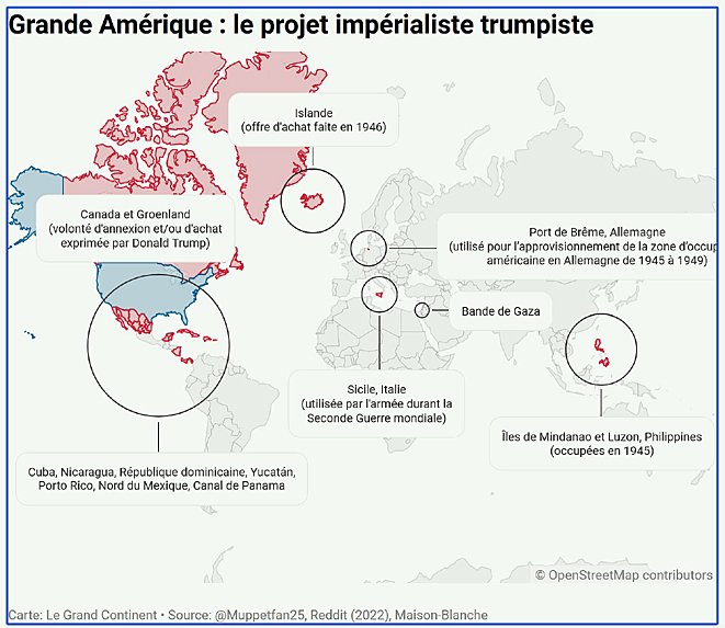 - Finie la liberté des peuples à disposer d’eux-mêmes : ils sont sommés de prêter allégeance au « grand frère » le plus proche (la Russie de Poutine pour l’Ukraine, la Biélorussie, la Géorgie, la Moldavie, et bientôt les pays baltes ; le Canada, le Groenland, le Mexique et toutes l’Amérique latine pour les États-Unis – de même que l’Europe occidentale ; Taïwan et l’Asie du sud-est pour la Chine).