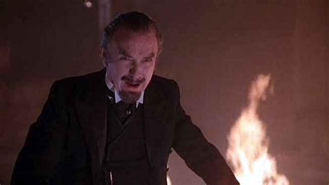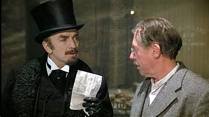 L’inspecteur Lestrade (Jeffrey Jones), toujours jaloux des talents supposés de Holmes, le marque à la culotte, ce qui oblige Watson à utiliser les gamins des rues, qui sont les moineaux de Londres à l’époque, pour espionner et rendre compte. Wiggins, 12 ans (Matthew Savage), en est le chef malin et débrouillard. Il découvre rapidement que l’usine à papier n’a pas brûlé par hasard, que des mouvements suspects sur les Docks font débarquer des tonneaux d‘encre d’imprimerie entre deux cartons de chaussures italiennes. Justement les mêmes que celle qu’Holmes a arraché du pied d’un malfrat qui a tenté de l’agresser chez l’imprimeur. Watson reconnaît, à la nuit tombée, Moriarty (Paul Freeman), l’esprit du Mal, qui est derrière tout cela. Il tente de s’agripper à un cordage pour suivre la chaloupe à moteur de Moriarty sur la Tamise, mais ce balourd de Holmes crie et le fait remarquer. Il doit alors lâcher prise et essuyer une grêle de balles. On ne retrouve pas son corps.