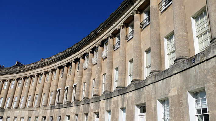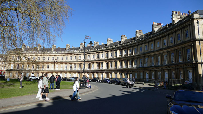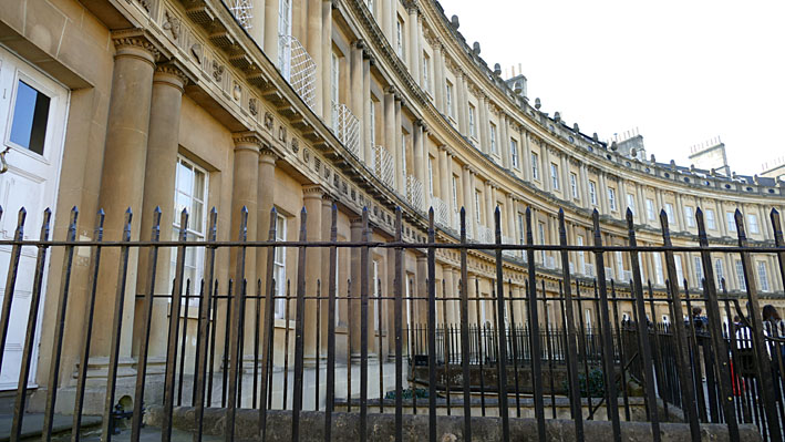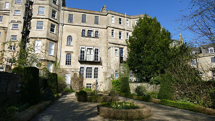 Le Crescent, au sommet de la colline, devant une pelouse et un parc, se présente comme un demi Circus, un demi-cercle aux 140 colonnes. L’architecte John Wood l’a créé en style géorgien. Nous visitons justement un jardin géorgien dont l’architecture est proche du jardin à la française, avec ses massifs de buis bien taillés. Des fouilles de 1985 ont révélé un jardin de 1770, restauré en 1990 selon les sources documentaires. Les plantes étaient semées comme des curiosités pour elles-mêmes, non pour l’effet qu’elles donnaient dans l’ensemble. On privilégiait les parfums et les fleurs doubles, les arbustes et les plantes annuelles.