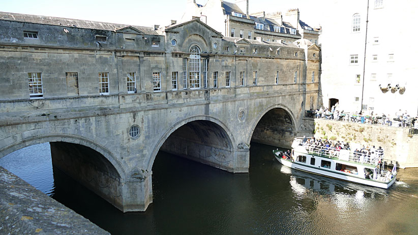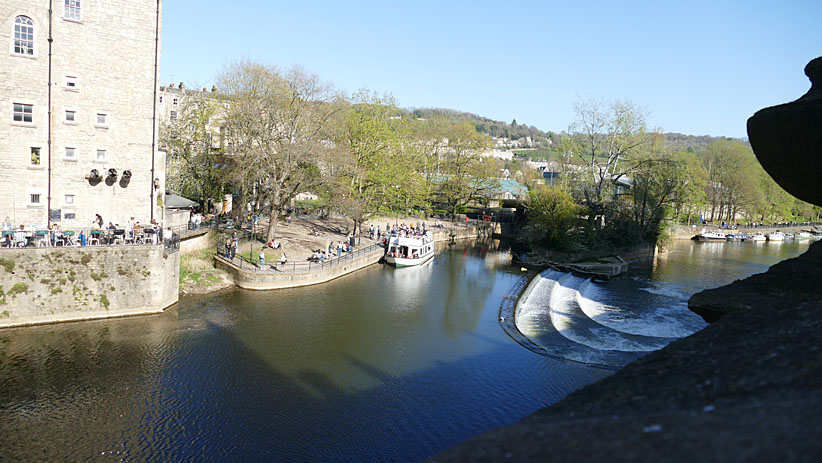 Nous redescendons par les rues animées, passons devant le plus ancien pub de Bath, datant de 1713, à l’enseigne politiquement incorrecte de Saracens Head, la tête de sarrasin. Charles Dickens y aurait écrit les Pickwick Papers. Le pont Pulteney aux trois arches supportant des boutiques incorporées comme à Florence, est très couru par les touristes. Sous ses pierres coule la rivière et son déversoir. Au bord de l’eau, des jeunes sont assis sur la pelouse. Nous avons marché peu près deux heures dans la ville. Nous sommes samedis et les Anglais ont sorti leur kids, mais nous n’en voyons pas tant que cela, à croire qu’ils n’en font plus.