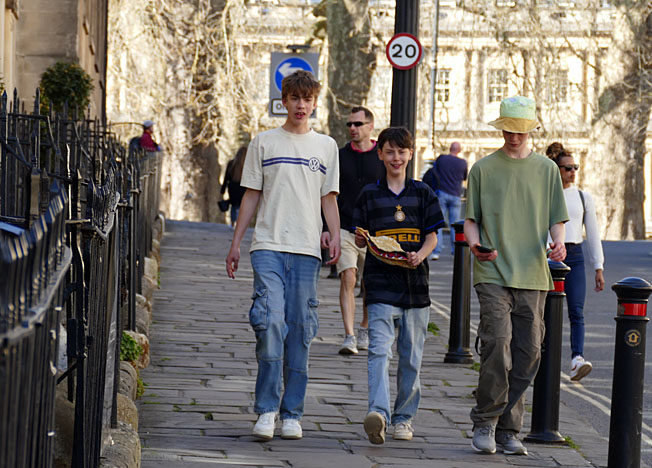 Nous montons vers le Circus, une architecture palladienne avec trois arcs de cercle, les bâtiments sur trois niveaux ornés de colonnes doriques, ioniques, corinthiennes. Il y a du soleil mais du vent, il fait chaud à l’abri des froids exposés. Un gamin blond de 10 ou 11 ans en chemisette blanche ornée de citrons, au col ouvert, vend de la citronnade au pied de son immeuble. Il n’est pas frileux et se fait un peu d’argent en ce samedi ou beaucoup de promeneurs circulent.