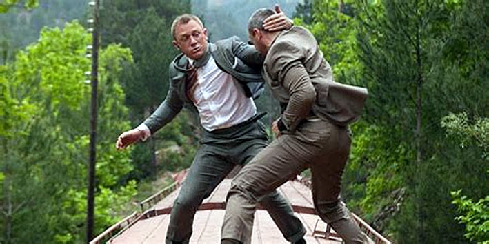 James Bond vole un bateau pour sauver Camille, mais celle-ci veut rester avec Medrano, avec qui elle a un compte à régler : c’est lui qui a tué ses parents après avoir violé sa mère et sa sœur sous ses yeux alors qu’elle était petite fille. Nouvelle course poursuite en bateau, spectaculaire, puis Camille évanouie est confiée à un portier d’hôtel sous prétexte qu’elle a le mal de mer. Bond pique une voiture et appelle le MI6 pour leur donner le nom de Greene. M appelle la CIA pour savoir si ce nom les intéresse, et la Centrale fait semblant de ne pas le connaître – alors que l’agentl reçoit l’appel dans l’avion privé de ce dernier. Dominic Greene est réputé philanthrope à la tête de Greene Planet, recevant des dons pour sauver des étendues de terre par rachats. Bonne couverture pour des activités de prédation – où America First sévit à l’envi.
