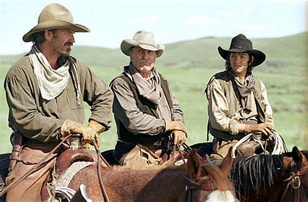 Un éleveur « Boss » Spearman (Robert Duvall) et ses trois cow-boys, Charley (Kevin Costner), le gros Mose (Abraham Benrubi) et l’adolescent de 16 ans John « Button » (Diego Luna, 24 ans) conduisent un troupeau de bovins vers l’ouest en traversant en l’an 1882 les terres du gros fermier qui a absorbé ses voisins par la menace, Denton Baxter (Michael Gambon). Tout irait bien s’ils n’avaient oublié « le café ». Il faudrait en acheter à la ville qu’on vient de passer, avant de poursuivre la route. Button se propose, mais il est trop tendre pour son Boss, d’où son surnom de fleur encore à éclore. Spearman l’a ramassé dans une ville du Texas « il y a quelques années » alors qu’il fouillait les poubelles pour manger. Il en a fait son employé et veille sur lui comme sur un fils adoptif. On apprendra en effet qu’il a perdu sa femme et son fils de 7 ans du typhus, des années auparavant. Il envoie donc plutôt Mose, un ours plutôt gentil avec les gens et qui s’occupe de l’intendance.