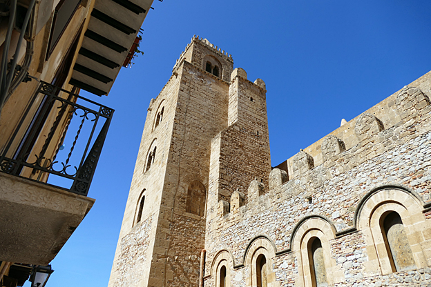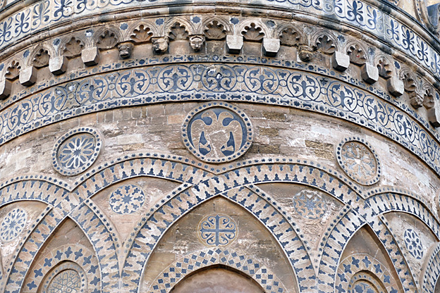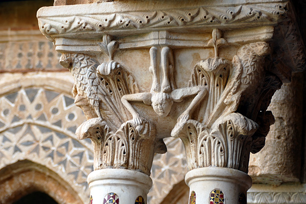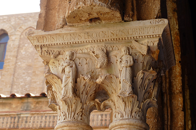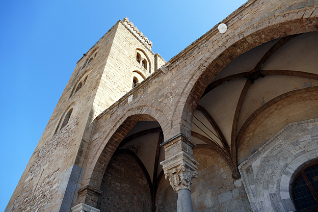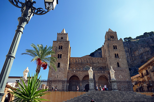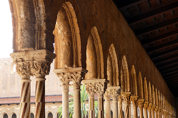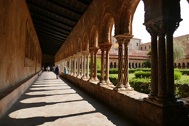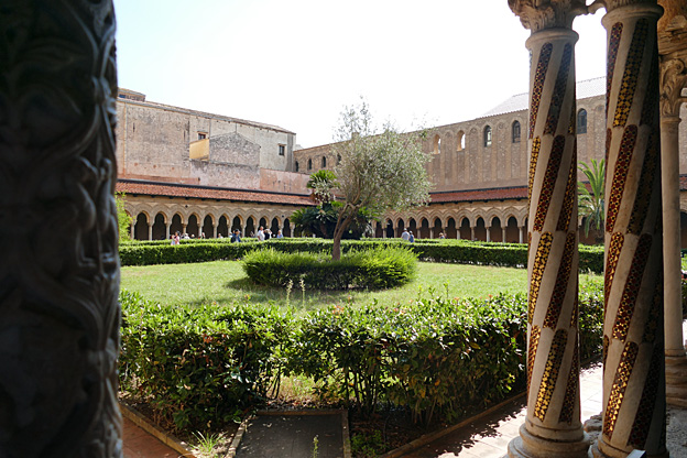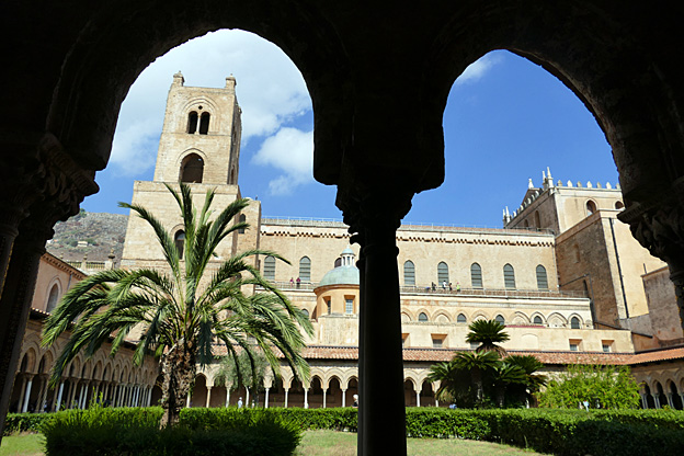 La ville de Mont Royal a été élevée sur le mont Caputo, dominant la vallée de l’Oreto et la Conca d’Oro, la conque d’or, nom donné à la baie de Palerme. Nous visitons l’abbaye bénédictine Sainte-Marie la neuve, fondée en 1174 par le roi Guillaume II. C’est le chant du cygne de l’art normand de Sicile. La cathédrale Unesco est ornée à l’entrée d’une Porta Regia en bronze de Bonnano Pisano de 1186 ; avec ses 7,8 m sur 3,9 m, ce sont les plus grandes portes en bronze de leur époque. Elles comportent quarante panneaux qui représentent des scènes de l’Ancien et du Nouveau testament. La façade comporte deux tours, dont une inachevée, et un portique à colonnes. L’abside comporte des arcs entrelacés à colonnes de style normand avec des incrustations de calcaire et de lave noire de style byzantin.