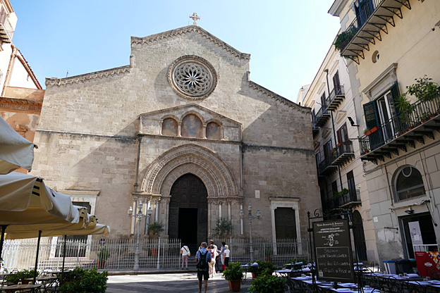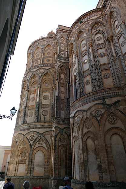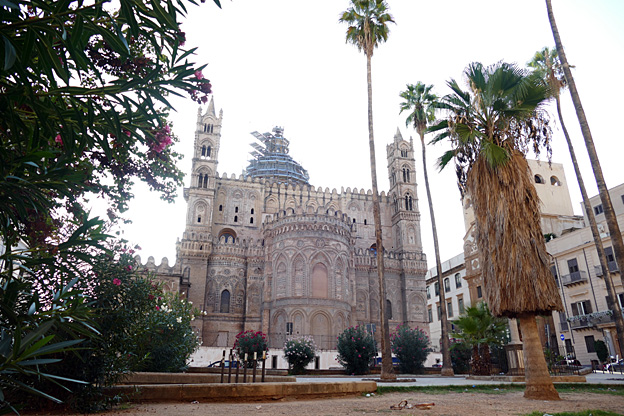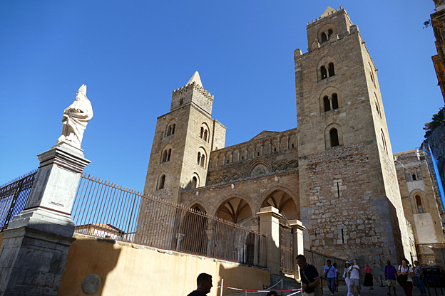 Nous terminons la journée par un retour au premier jour, à la cathédrale, fondée en 1170 mais lourdement corrigée aux XVIIIe et XIXe siècle. L’extérieur côté chœur est décoré d’incrustations de basalte noir aux motifs géométriques, de style arabo–normand. La cathédrale a été bâtie sous Guillaume II, mort sans héritier en 1189. La chapelle de Rosalie présente une châsse en argent et un portrait par un peintre qui aimait à se croire célèbre.