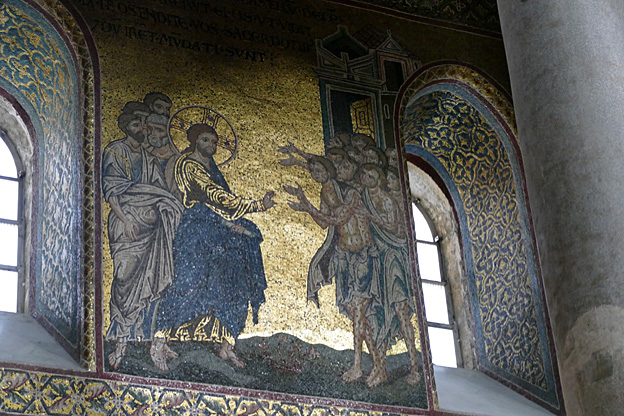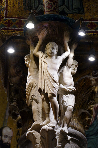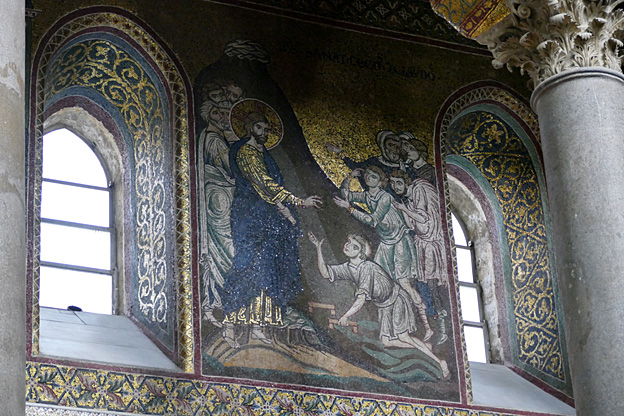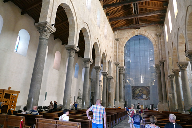 L’intérieur est grand et justifie la queue qui cherche à entrer. Nous n’y sommes pas serrés dans ces 102 m de long entre les dix-huit colonnes antiques séparant les trois nefs. Les 6340 m² de mosaïques des XIIe et XIIe sont probablement l’œuvre d’artistes locaux, ou certains venant de Venise car elles sont moins sévères que les byzantines. Dans l’abside centrale le Christ Pantocrator, la Vierge et l’Enfant entourés d’anges, d’apôtres et de saints ; dans le chœur, la vie du Christ et les vies de saint Pierre et saint Paul. Le premier est le fondateur de l’Église, sur les ordres du Christ, le second est le fondateur de la Doctrine.