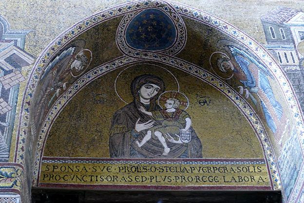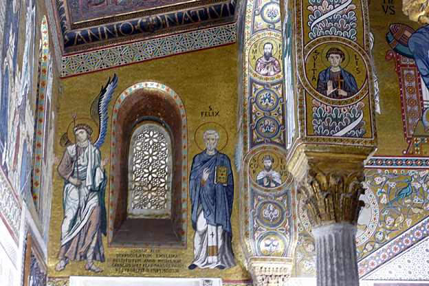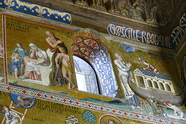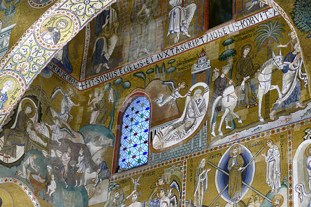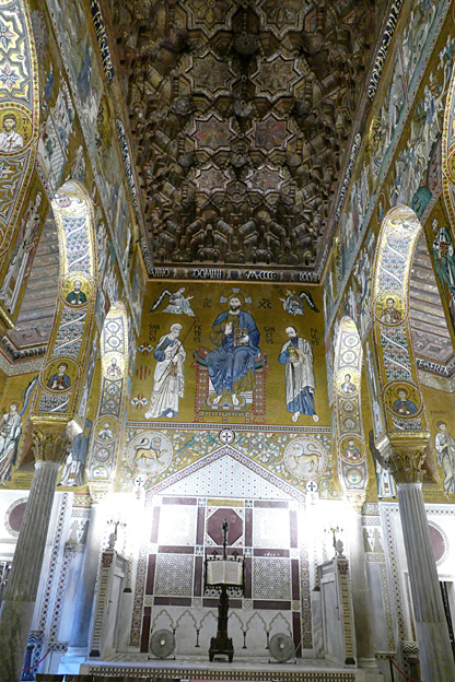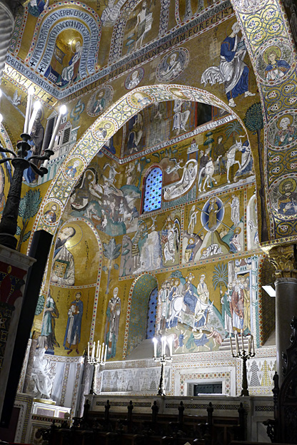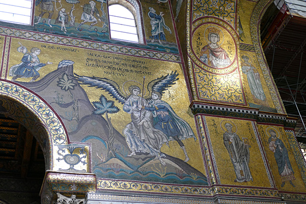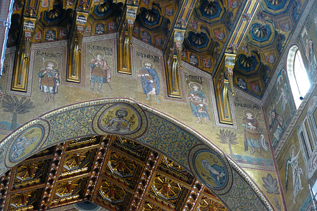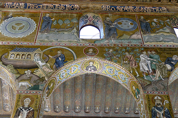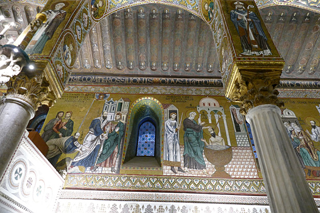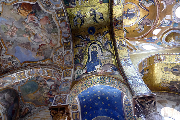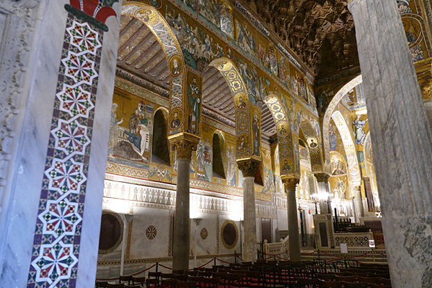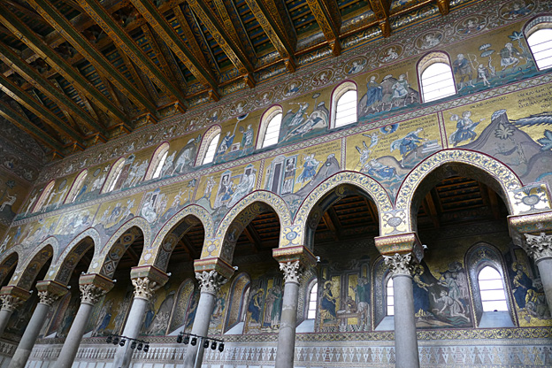 Des mosaïques byzantines sur fond d’or ornent les murs et le chœur avec un Christ Pantocrator surmontant une Vierge orante, les Évangélistes, les Prophètes, les Archanges, les Anges, saint Pierre et saint Paul – tout ce petit monde est disposé hiérarchiquement autour du Fils de Dieu. Les artistes sont probablement venus du Moyen-Orient tant leur style est maîtrisé. Les mosaïques du vaisseau sont des scènes tirées de l’Ancien testament. Le Christ bénissant tient l’Évangile ouvert à la page où se trouve la phrase en grec et en latin : « Je suis la lumière du monde, celui qui me suit ne marchera pas dans les ténèbres, mais il aura la lumière de la Vie. » Dans la Création des animaux, manque le serpent. L’entrée du Christ a Jérusalem voit des enfants se mettre nus pour paver le sol de leurs vêtements. Saint Pierre marche aux côté du Christ et saint Jean derrière.