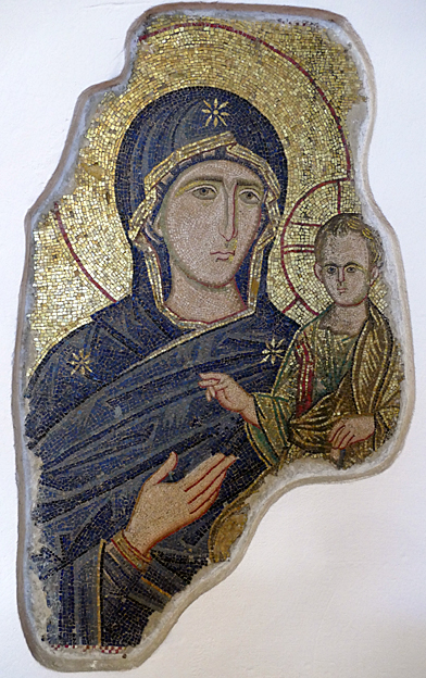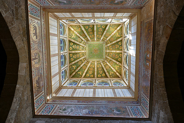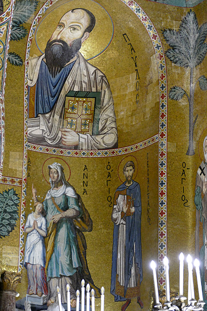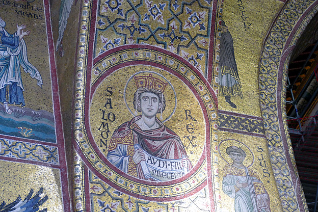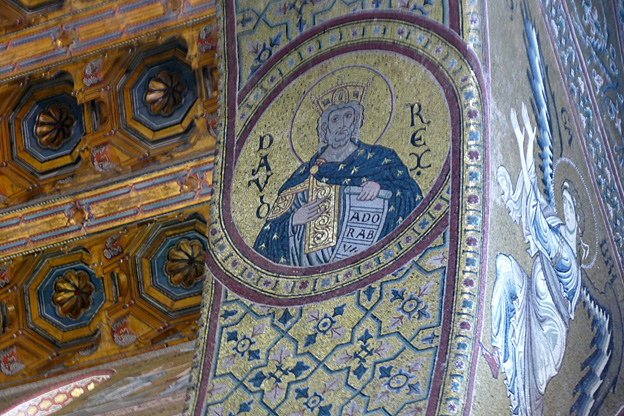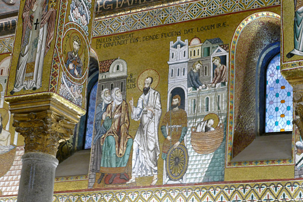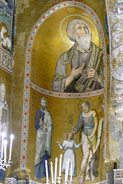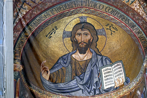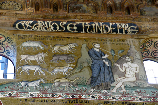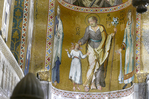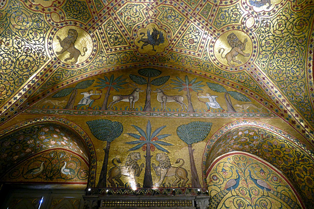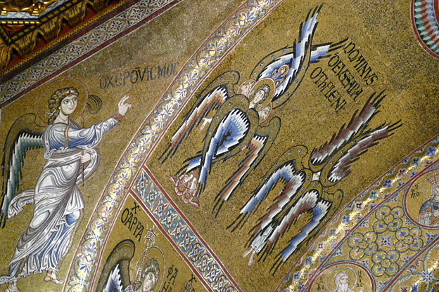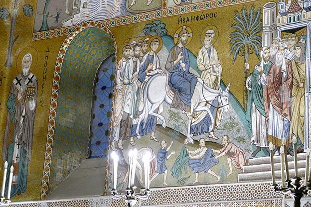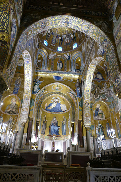 Des mosaïques byzantines sur fond d’or ornent les murs et le chœur avec un Christ Pantocrator surmontant une Vierge orante, les Évangélistes, les Prophètes, les Archanges, les Anges, saint Pierre et saint Paul – tout ce petit monde est disposé hiérarchiquement autour du Fils de Dieu. Les artistes sont probablement venus du Moyen-Orient tant leur style est maîtrisé. Les mosaïques du vaisseau sont des scènes tirées de l’Ancien testament. Le Christ bénissant tient l’Évangile ouvert à la page où se trouve la phrase en grec et en latin : « Je suis la lumière du monde, celui qui me suit ne marchera pas dans les ténèbres, mais il aura la lumière de la Vie. » Dans la Création des animaux, manque le serpent. L’entrée du Christ a Jérusalem voit des enfants se mettre nus pour paver le sol de leurs vêtements. Saint Pierre marche aux côté du Christ et saint Jean derrière.