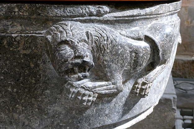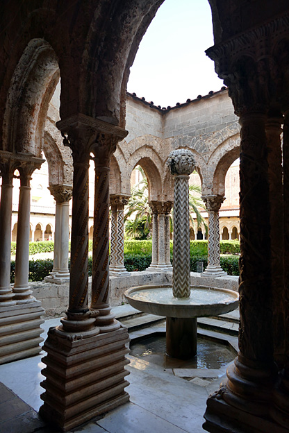 Nous visitons la cathédrale Unesco bâtie sur ordre de Roger II, roi de Sicile en 1132 après une tempête où il avait failli y rester. Deux tours romanes carrées, de pierre blonde et le dôme – en réfection, tout emmailloté d’échafaudages. A l’intérieur, la mosaïque du Christ Pantocrator de 1148 et de la Vierge orante nous sont invisibles. La nef est composée de colonnes de basalte aux chapiteaux grecs retaillés, surmontés d’arcs arabes. Un baptistère, des statues en stuc autour de l’autel, un ange de l’Annonciation. L’église ferme juste quand nous partons. De même que le lavoir médiéval, juste le temps de le voir dans une impasse de la via Vittorio Emmanuele.