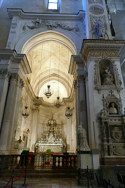 Nous visitons la cathédrale San Bartolomeo, reconstruite au XIIIe, remaniée en 1654 et à façade de 1861. La statue en argent du saint tient un couteau de la main gauche et sa peau sur son bras droit : il a été écorché vif.
