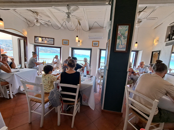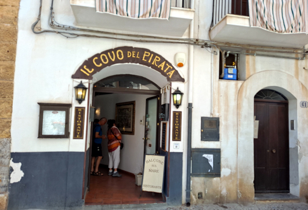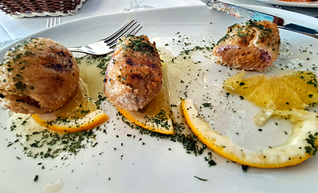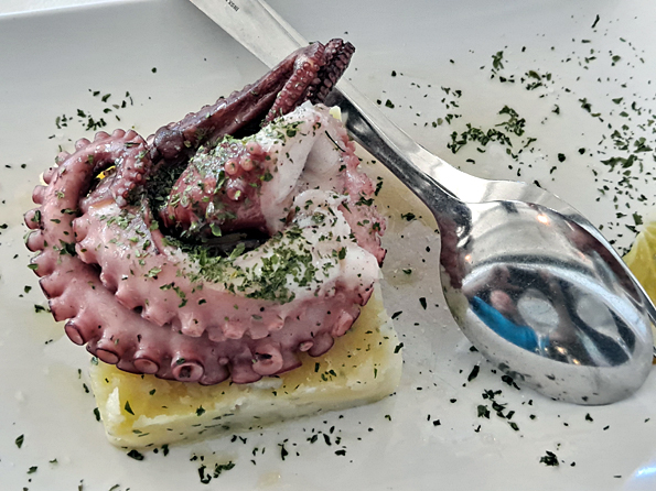 Le déjeuner étant libre, je fais table avec quatre autres personnes, les deux couples de l’infirmière et des profs au restaurant Al Pescatore sur la piazzetta di Marina Corta où trône la statue de san Bartolomeo. Je prends un poulpe grillé servi avec deux lambeaux de fromage, une tomate cerise sur une cuillerée d’encre de seiche et une cuillère à café de purée de pois verts. C’est le style nouvelle cuisine pour 20 € avec une salade de roquette, fenouil et quartiers d’orange assaisonnée d’huile d’olive et de vinaigre balsamique. Je retiens la recette.