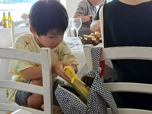 Nous déjeunons libres à la Cave des pirates à côté du lavoir, toujours le même menu de salade de poulpe, pâtes aux aubergines ou fruits de mer, poissons. Je prends de l’espadon roulé farci avec ses tranches d’orange et c’est tout. Mirande goûte les pâtes aux aubergines et prend avec Eloi la salade de poulpe sur lit de purée compacte pour deux, tout comme les Japonais d’une table voisine. Il s’agit d’un couple assez jeune avec un petit garçon poupée. Il peut avoir cinq ou six ans et il pique les morceaux de poulpe avec appétit, moins les pommes de terre. Il avale ses spaghettis aux palourdes comme un Japonais, avec un slurp à la fin. Sa mère lui a appris à tourner avec la fourchette et il tourne d’abord, mais les pâtes glissent et il termine comme tout le monde en aspirant le filament qui se tortille. Les Japonais sont conformistes et apprennent dès l’enfance à faire comme les autres ; à l’étranger, on fait comme les étrangers, ici les Italiens. Pas question de rester rustre. Les pâtes aux aubergines ont une sauce tomate mijotée à l’ail et au basilic (au dernier moment, une fois la sauce épaissie) et des rondelles d’aubergines frites à l’huile d’olive.