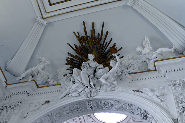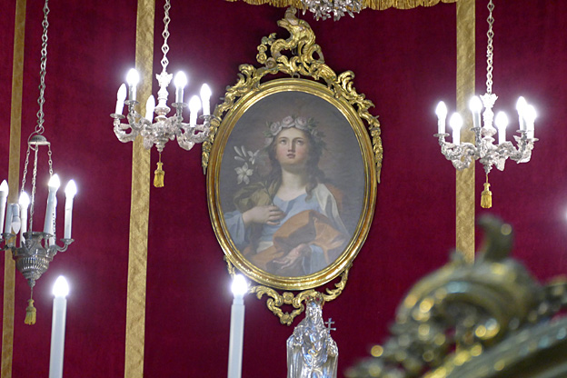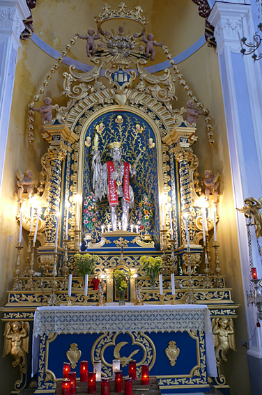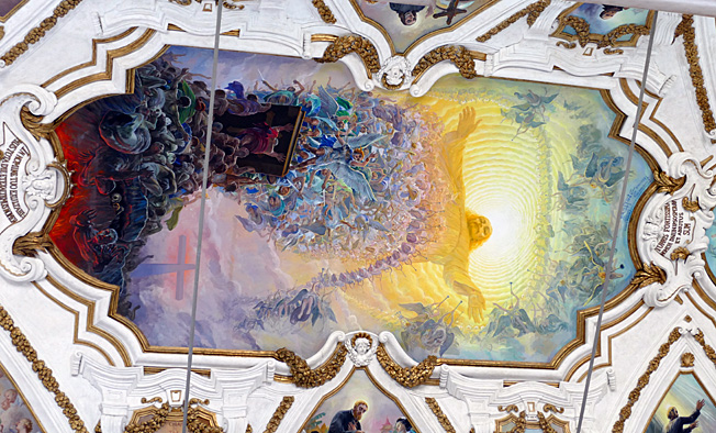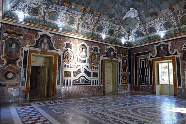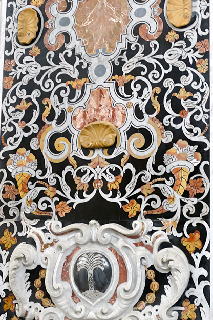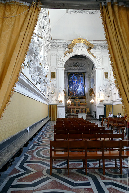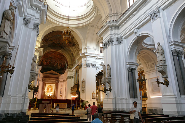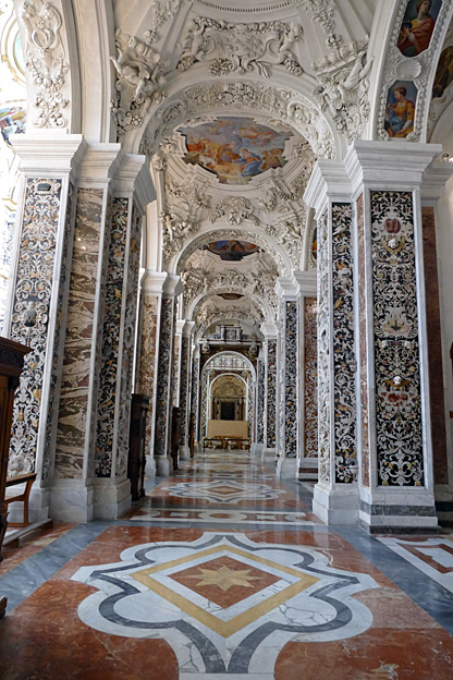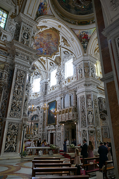 En passant, l’église du Gesu, élevée entre 1564 et 1633, à la coupole baroque du XVIIe et au décor de stuc et marqueterie de marbres sicilien du XVIIIe siècle baroque exubérant. Un mariage s’y tient. Les murs sont en mosaïque de marbres polychromes, les putti sont en stuc, des peintures ornent tous les endroits laissés libres. C’est un peu lourd, incite au fusionnel, à l’unisson du regard, sans aucun recul.
