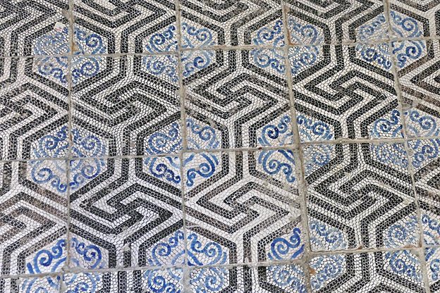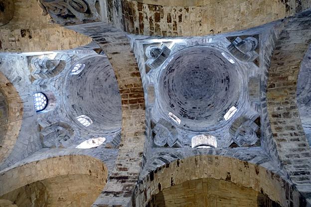 À côté de la Martorana, après le déjeuner, nous revenons voir l’autre église Unesco, San Cataldo. Saint Catalde est né au VIIe siècle en Irlande, à Munster ; devenu abbé, il pèlerine en Terre sainte et est élu, sur le chemin du retour, évêque de Tarente. Construite en 1160 en style-arabo-normand, elle a pour caractéristique un plan carré, un véritable cube de pierre surmonté de trois coupolettes rouge vif comme en orient arabe. Ce sont les trois petites excroissances d’une chapelle du palais transformée en église de style arabo–normand. Les ouvriers étaient en effet Fatimides et ont orné l’intérieur d’un pavement de marbre serpentin et de dalles de porphyre rouge. On peut apercevoir une nette séparation entre le chœur aux mosaïques et la nef agrandie ornée de peintures. Les mosaïques présentent la vie de la Vierge en trois étapes, l’Annonciation, la Naissance du Christ, la Dormition.