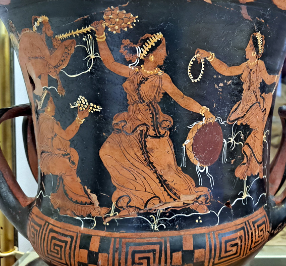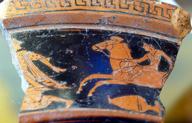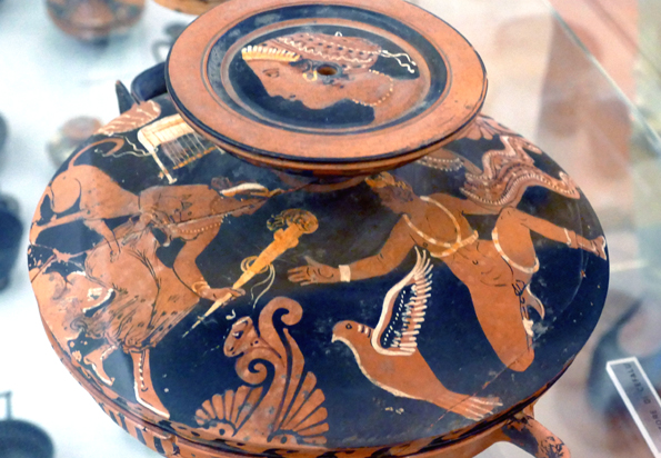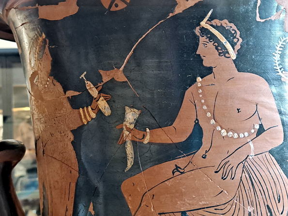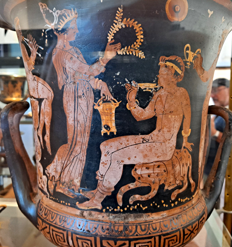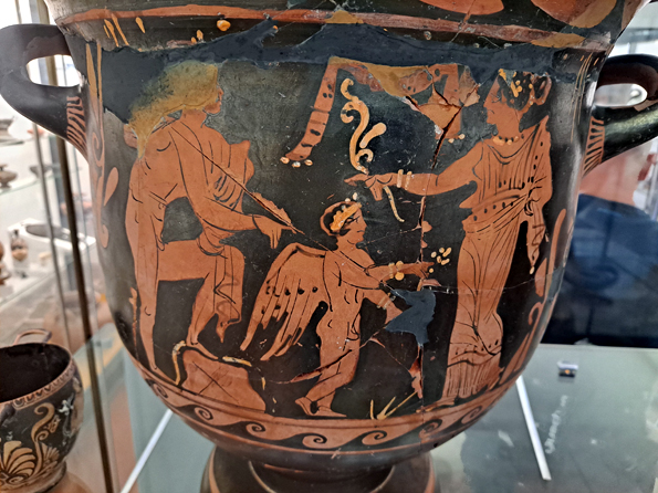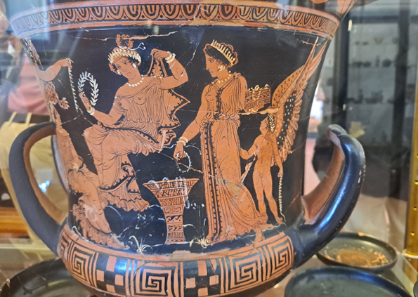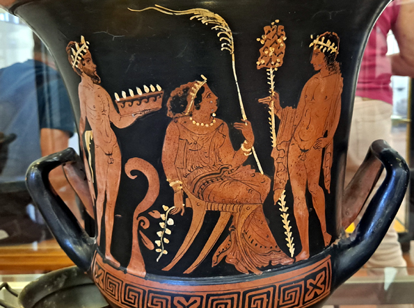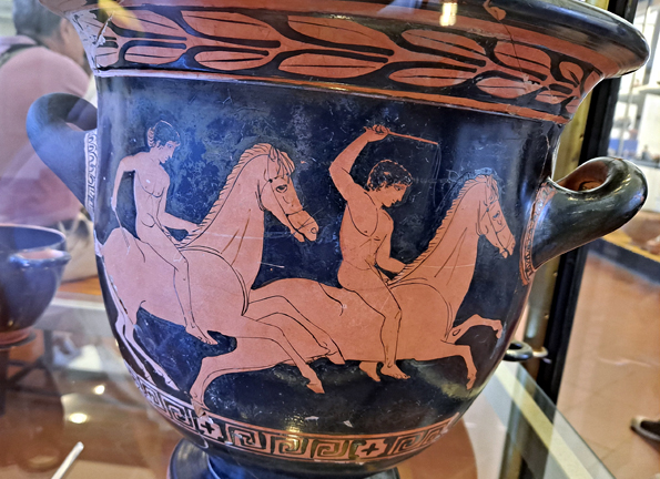 De beaux vases grecs peints à Lipari au IVe siècle sont une habile imitation locale. Mais ils sont difficiles à photographier en raison des reflets sur les vitrines, l’éclairage étant mal fait (ou fait exprès). Ils présentent des scènes classiques de combat ou de conversations entre barbus et imberbes, des athlètes jeunes et nus, une chevauchée nue et à cru, des danses et de la musique, Dionysos.