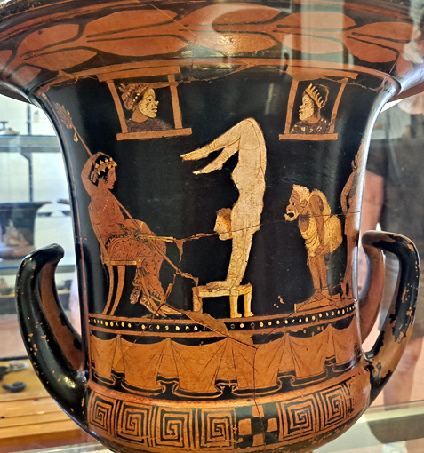 La colonie grecque a laissé des vases ornés de scènes mythologiques et de la comédie. Des reproductions de masques romains en terre cuite représentent des personnages du théâtre. Des comédies de Plaute, un petit esclave nu revient du marché, tenant un panier et une bourse ; une femme esclave ivre, un vieux déconcerté. Une autre vitrine met en scène « a procuress and the nude courtisan ».