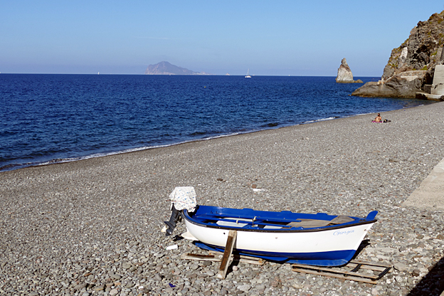 Dès 15 heures, nous effectuons le (célèbre) tour de l’île de Lipari en minibus. Nous apercevons bien le volcan Etna et les îles voisines dans l’atmosphère éclaircie. Nous passons la grande coulée d’obsidienne de Forgia Vecchia, dont les morceaux servent de galets sur la plage, puis la carrière de pierre ponce de Canneto – l’enfer blanc de Mussolini où il faisait travailler les prisonniers – abandonnée il y a quelques années. Trois arrêts photos font touristes du troisième âge aux points de vue et belvédères d’Acquacalda et de Quattrocchi. L’Etna éjacule son panache perle dans un ciel d’azur. Des bateaux de plaisance font leur ronde tandis que le ferry des Siremar passe au large, clinquant.