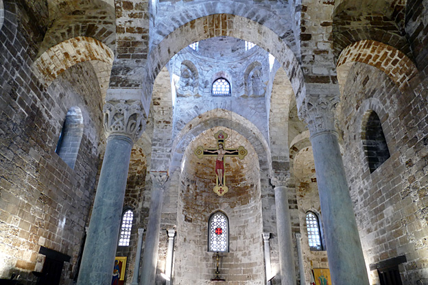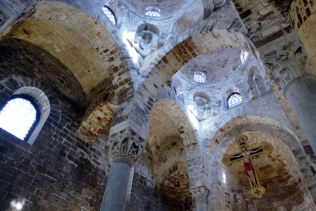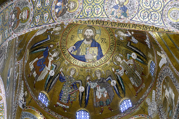 La façade est baroque 17e mais l’édifice est en croix grecque et présente des mosaïques byzantines sur fond d’or. Le Christ en majesté est cette fois visible, flanqué de huit prophètes et de quatre évangélistes. Une mosaïque à droite de la nef montre Roger II couronné par Jésus, sans passer par le pape. Tous les hommes sont pécheurs, donc doivent arborer l’air sévère, en attente de la sévérité de Dieu, selon l’esthétique byzantine. En face à face, l’émir Georges est aux pieds de la Vierge et humblement aplati. La coupole est bâtie sur un octogone. Ce passage architectural du plan carré de la nef au plan circulaire de la coupole via la forme octogonale est symboliquement le passage de la terre au ciel.