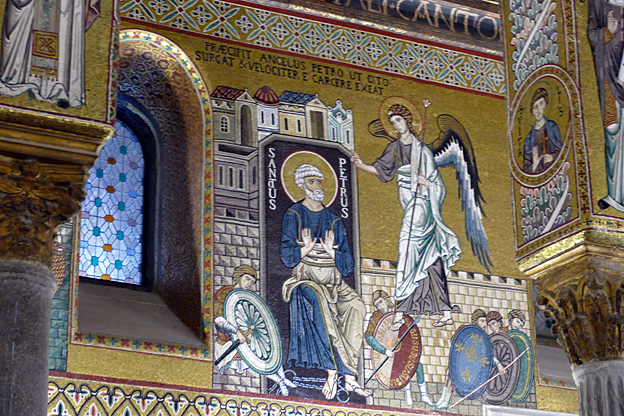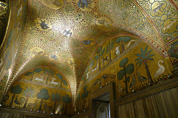 La chapelle palatine de Roger II, bâtie en 1132 et consacrée en 1140, est dédiée à saint Pierre. Elle est ainsi nommée parce qu’elle se trouve dans le palais du roi. L’ensemble est particulièrement somptueux, synthétisant toutes les formes d’arts de la Méditerranée en l’an mil : architecture romane mais colonnes antiques, arcs brisés arabes dans la nef, mosaïques byzantines du XIIe, marbre et pavement de la Rome de Cosme, coupole byzantine. Le pavement de marbre aux motifs stylisés est typiquement arabe. Son plafond en bois à muqarnas arabes présente une suite de caissons finement décorés. Trois nefs et trois absides, chœur surélevé. Le trône de Roger II se trouve tout au fond de l’église, en face de l’autel.