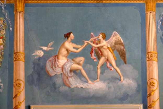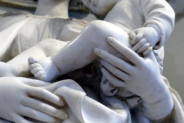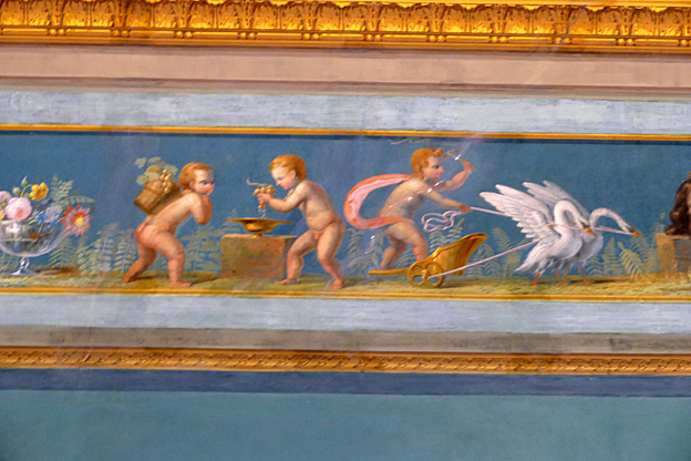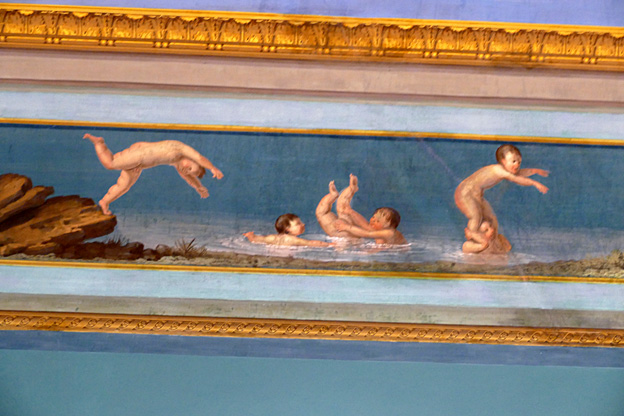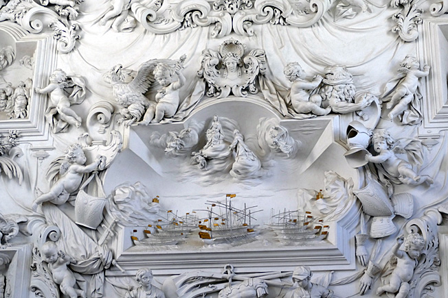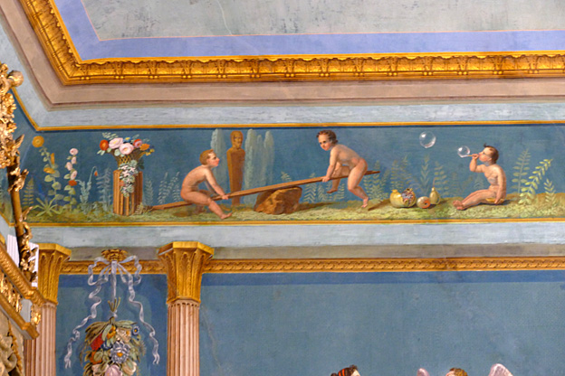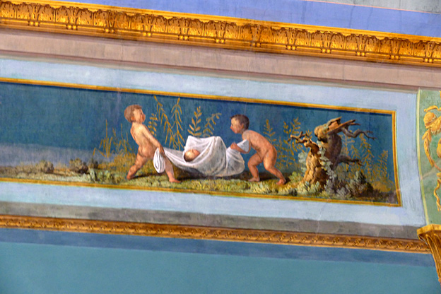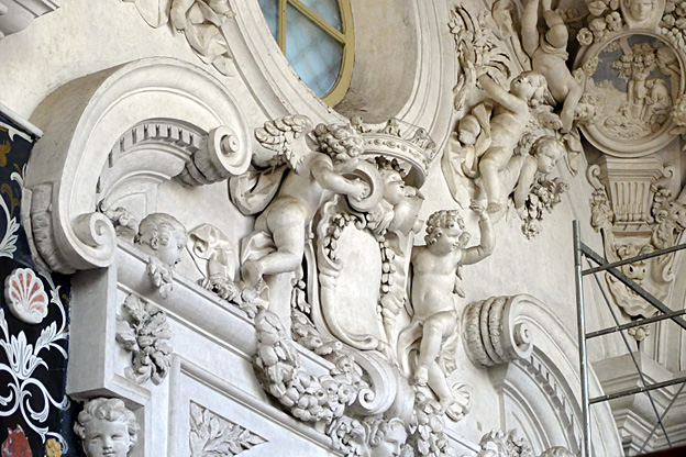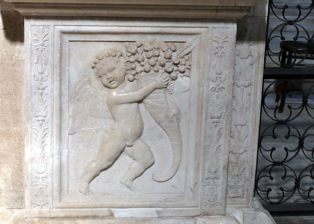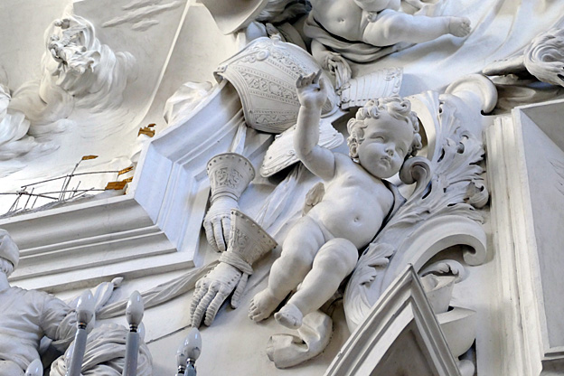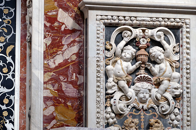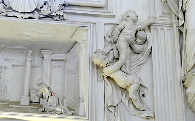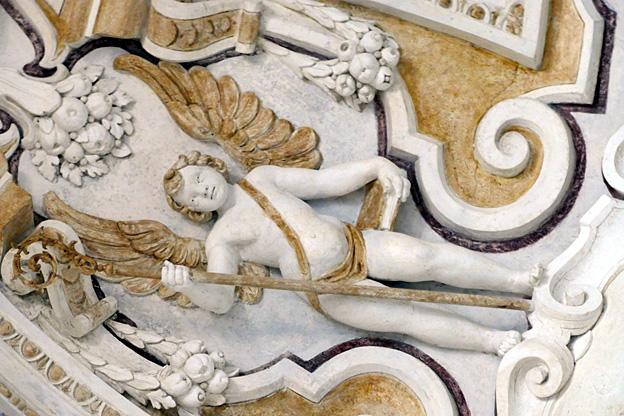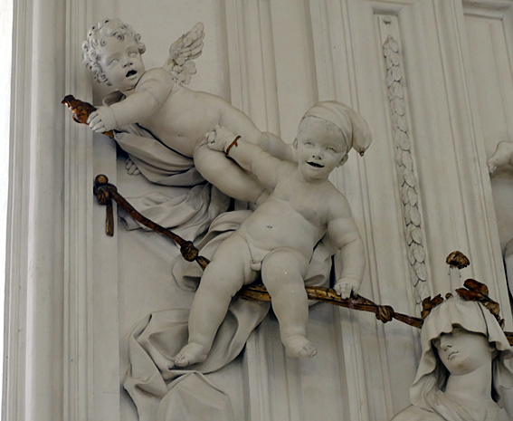 Mais l’oratoire de San Lorenzo est encore meilleur, les putti de Serpotta en 1723 osant allègrement jouer à des jeux érotiques. L’un caresse le ventre de l’autre tandis qu’il piétine le zizi d’un troisième, un autre empoigne carrément la queue de son copain qui ouvre la bouche dans un hoquet de surprise, deux se regardent langoureusement, tout nu, deux autres dans le même appareil s’embrassent à pleine bouche. Les Franciscains de 1699 n’y voyaient pas malice.