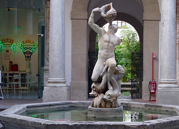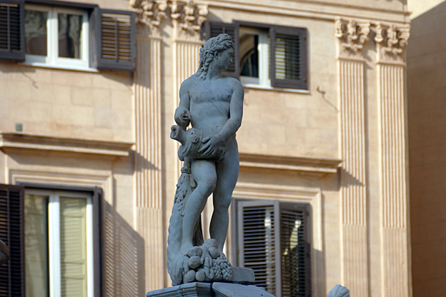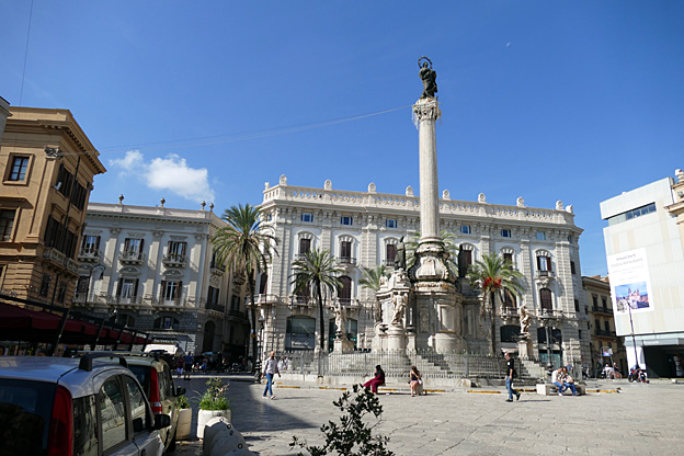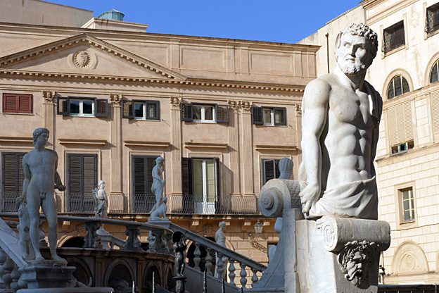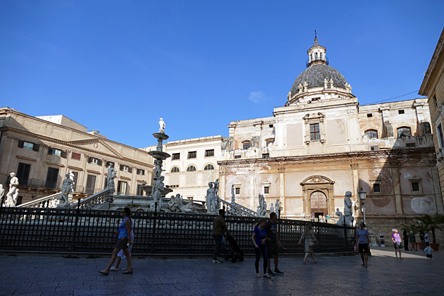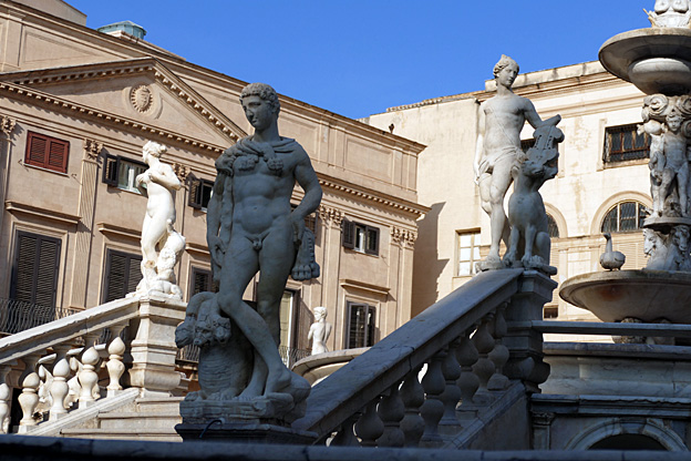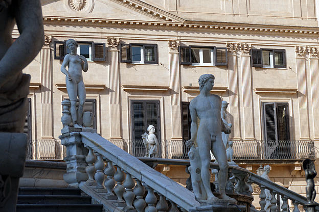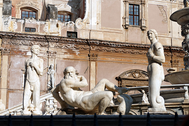 Place de la Vergogna (de la honte), en réalité piazza Pretoria, trône une gigantesque fontaine de marbre aux nombreuses statues imitées de l’antique, œuvre de Camilliani et de Naccherino (1555-1575). La honte parce que le prince n’avait plus assez de fonds pour finir et à intrigué pour la faire financer par le Sénat de Palerme.