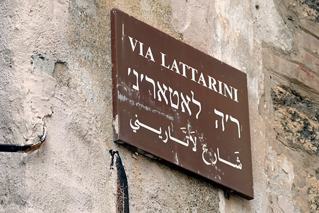 Nous repassons dans les ruelles étroites du quartier de la Kalsa, les restes de la Palerme arabe. L’endroit était hier sale et populaire, il est aujourd’hui de plus en plus rénové et bobo. Mais une rue au marché typique est devenue le lieu de la fripe et de la malbouffe, avinée et assourdissante le soir, comme le dit le guide. La voie des Latrines ? des laitiers ? des Lattarini ? La via Lattarini a sa plaque écrite en trois langues, comme au temps des Normands : en latin, hébreu et arabe.
