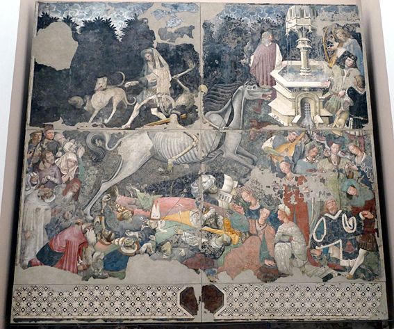 Nouvel arrêt, dans la ville de Palerme cette fois, pour voir en coup de vent (en moins d’une heure) le musée régional dans le palais Abatellis. C’est hors programme et il doit fermer à 18 heures. Il recèle quelques trésors. Notamment une grande fresque du XVe siècle du Triomphe de la Mort où les Importants sont représentés en beaux costumes, la main à la ceinture au-dessus du pubis, signe des dominants. Ils sont touchés par les flèches du squelette qui chevauche le cheval squelettique et se retrouvent en bas du tableau, tout navrés. Dont le pape, la gorge transpercée d’une flèche. Les belles femmes aux robes à la mode et aux bijoux étincelants de même. Sur la gauche, les pauvres, vieux, handicapés, bancroches, lépreux, restent tel qu’ils sont : en bas. Deux personnages regardent le spectateur, le peintre et son fils préparateur. Nul ne connaît leur nom. Le thème est tardif car la dernière Grande peste date de 1348.