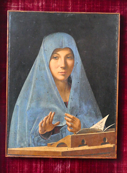 La Vierge de l’Annonciation d’Antonio da Messina se trouve ici. Le tableau est sobre, délicat, symbolique. La Vierge élève une main qui s’effraie tandis que l’autre accepte. Elle a le visage en ovale, le voile bleu et la lumière qui vient de l’arrière, comme probablement l’archange annonciateur. Il n’est pas représenté, ce qui est nouveau dans l’art, pour mettre l’accent avant tout sur la jeune fille.