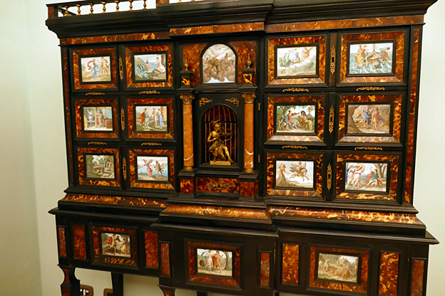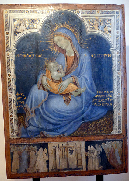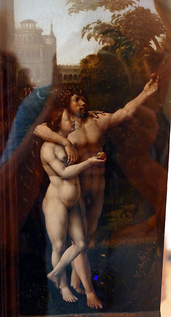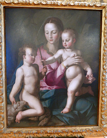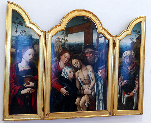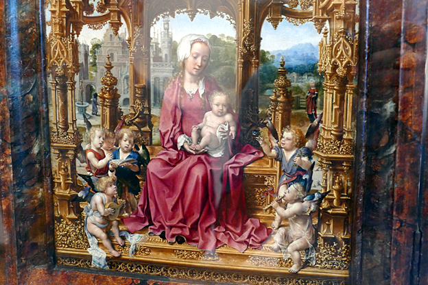 La Madonne au Bambin et trois anges est de Jean Gossaert, de Maubeuge, fin XVe. Il présente toute la progéniture de putti dodus et roses à demi déshabillés, de la maternité triomphante. Tous chantent de joie et à la gloire de l’Enfant.