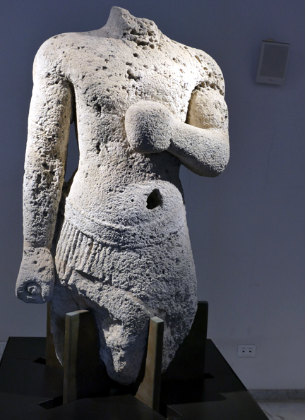 Dans un couloir, une statue romaine de l’empereur Claude, régnant de 41 à 54 de notre ère, un fragment de torse mâle délicat de la même période, et deux sarcophages puniques de Cannita.