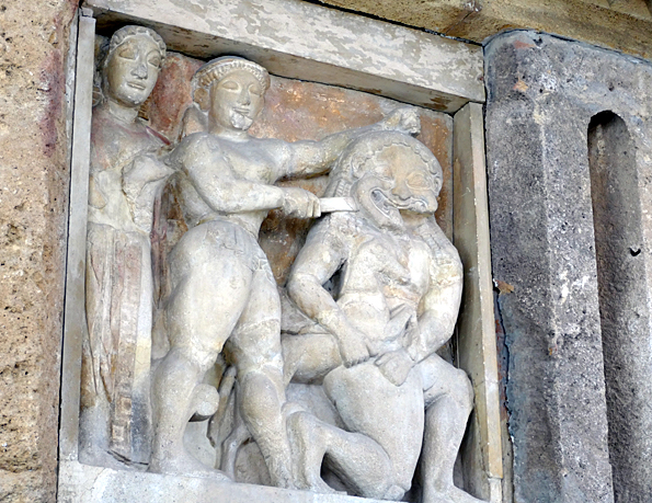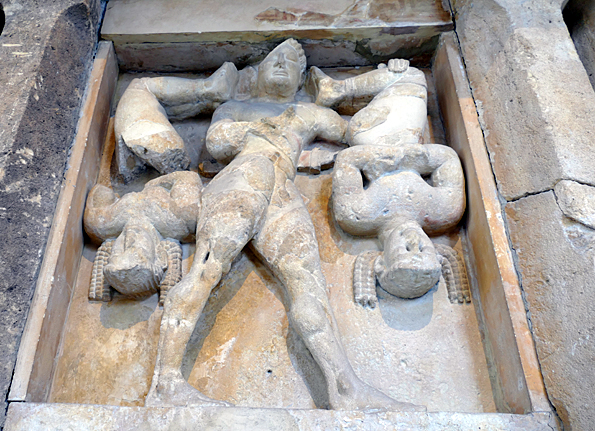 Les trois métopes du temple C taillés dans du tuf blanc vers 520 avant, montrent le quadrige du Soleil, Persée tuant Méduse, Héraclès châtiant les brigands Cercopes. Les Cercopes sont des enfants nains de Théia, fille d’Ouranos, qui ressemblent à des singes. S’étant moqué d’Héraclès, il les attacha la tête en bas et les transporta sur son épaule, ce qui leur permit de voir la pilosité noire de son cul. Leur mère les avait avertis qu’un certain Melampygos (fesses-noires) leur chercherait noise. Il faut dire qu’ils avaient tenté de voler les armes du héros pendant son sommeil.