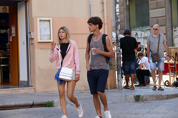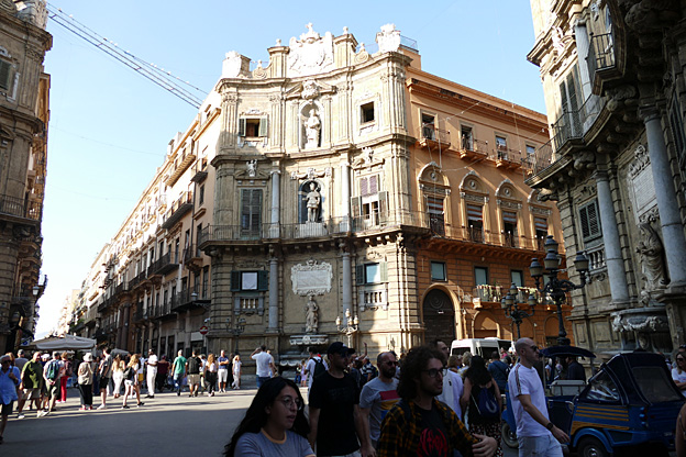 Juste après elle, la place des Quattro Canti, la rencontre des quatre quartiers historiques de la ville par le croisement des via Vittorio Emanuele et Maqueda. Elle fut tracée en 1620 sous le vice-roi espagnol. Pourquoi une fille porte-t-elle une robe moulante parme qui met en valeur ses seins en avant et ses fesses en arrière ? Son mec tatoué de partout en tee-shirt rouge vif, casquette rouge et baskets rouges, tatoué de partout, ne se rend pas plus compte qu’elle de l’apparence qu’il a. Une sorte d’affirmation de soi naïve, insolite, contente de soi. Il faut s’aimer fort pour se présenter ainsi au naturel, sans chercher à corriger ses défauts.