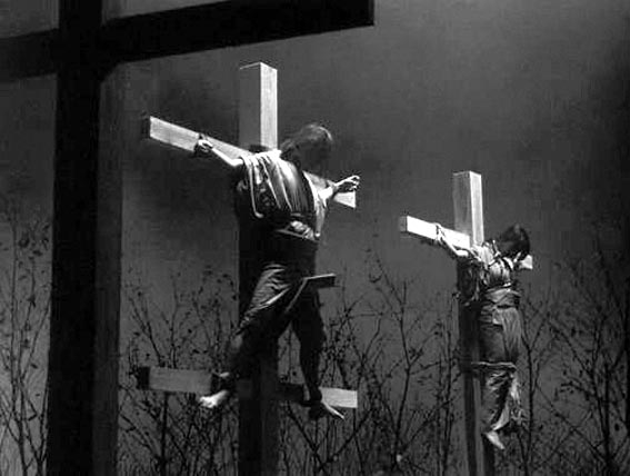 La mère de San est effarée : c’est la ruine assurée de tout le monde, du couple et de leurs deux familles, celle du mari Grand imprimeur et la sienne, le déshonneur complet. Mais rien n’y fait, la raison n’atteint plus ni San, ni Mohei. Ils sont dénoncés par Doki, pris, jugés, et crucifiés. Ce supplice chrétien est considéré comme vil depuis que le christianisme a été interdit en 1613 par le shogun et les convertis massacrés à Nagasaki. Mais ils sont heureux car amoureux, au-delà des classes car humains, rayonnants sur le cheval qui les conduit ligotés au sacrifice ; ils sont égarés, loin des lois sociales, par des lois supérieures. Mohei est innocent, mais c’est aussi sa faiblesse : pas coupable mais demeuré enfant. Il n’aurait pas dû rester pur en refusant de voler individuellement pour le bien social de sa maitresse, donc de la réputation des familles. Celle de San n’aurait pas dû vendre sa personne à un vieux riche laid pour se sauver socialement de la ruine. Mais les purs sont condamnés d’avance car ils ne transigent sur rien alors que les hypocrites s’en sortent toujours car ils changent d’avis et retournent leur veste. Les individus sont écrasés par le collectif social s’ils ne s’y soumettent pas.
