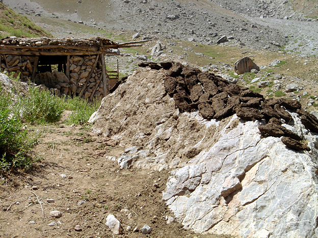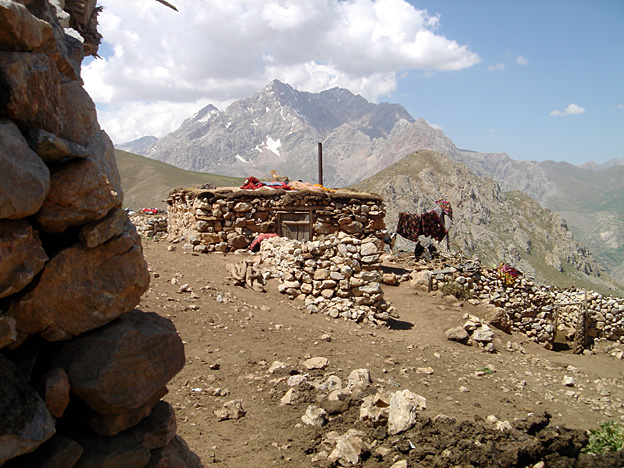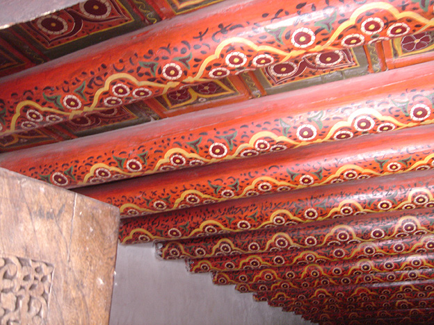 Les piliers de bois sculptés de l’iwan reposent en pointe sur une base en pierre.