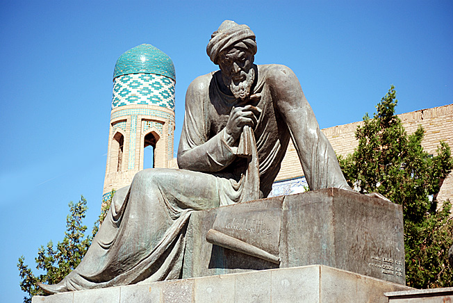Le rendez-vous est à 17h45 pour dîner à l’hôtel avant de se rendre à l’aéroport pour le vol intérieur qui nous ramènera à Tachkent, puis à Paris. Hors des remparts, le long du bassin d’eau glauque devant l’hôtel, face à la statue d’Algorithme, quelques gamins en slip ou portant débardeurs lâches, pêchent d’improbable poissons. Je n’ai vu nul d’entre eux en sortir un de l’eau. Le Persan Al-Khwarizmi a donné au IXe siècle, via le mot grec arithmos, le processus mathématique qui consiste en une suite finie et non ambiguë d’opérations pour résoudre un problème.