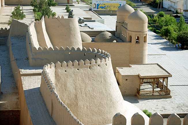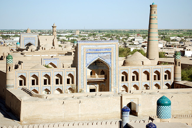 La salle du trône est décorée d’une sorte de stuc ciselé appelé ici « gantch ». Nous visitons des medersas, des mosquées. La Kounia Ark ou ‘vieille forteresse’ date pour ses parties les plus anciennes du 17ème siècle ; le reste est 19ème. Nous y montons, on y voit bien la ville de haut. Suit la medersa d’Islam Khodja qui s’ouvre dans le labyrinthe des rues. C’est son minaret de 56 m de haut qui attire l’attention. Il s’amincit progressivement, comme pour se perdre peu à peu dans le ciel. C’est du moins ce que croit le regard depuis son pied d’un diamètre de 9 m. Le tronc est tout annelé de couleurs orange, rouge et gris décoré, briques et majolique. Il date de 1908. Des enfants béent devant l’élan phallique ; nous ne sommes pas en civilisation patriarcale pour rien.