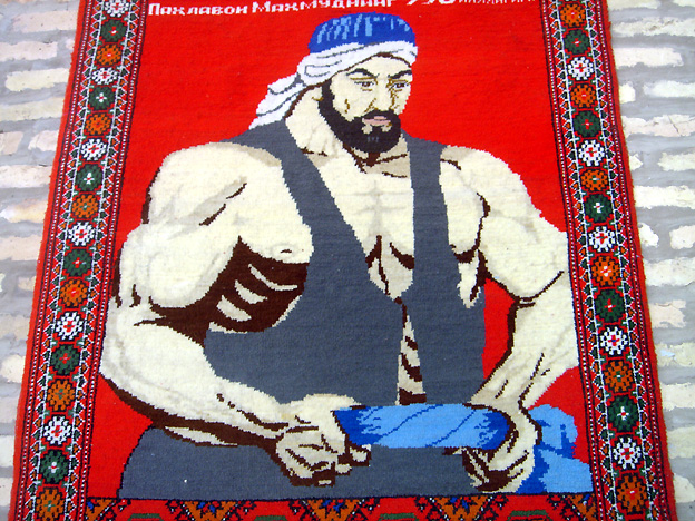 Le mausolée dédié au saint costaud Pakhlavan Mahmoud vaut le détour, pour la foule d’aujourd’hui plus que pour le monumental d’hier. Poète et lutteur né à Khiva, fort populaire fin 13ème siècle dans la ville car invincible, il est considéré comme un saint ayant le pouvoir de guérir. On dit que les Iraniens, les Indiens et les Pakistanais l’honorent aussi comme patrons des lutteurs. Il n’avait pas que des muscles mais aussi une tête et est l’un des fondateurs du soufisme. D’où la ferveur qu’ils suscite encore aujourd’hui, les femmes guidant les enfants, leur faisant baiser la grille devant son tombeau, les gens de tous âges s’agglutinant autour d’un imam barbu dès qu’il commence à chanter une prière, lui faisant aumône ensuite dans un tintement de pièces. Comme la chose est lucrative et que la ferveur nécessite de faire silence, nous devons calculer le moment de bouger, entre deux « affaires ». La cour recèle une source et, de l’extérieur, on aperçoit la coupole qui est la seule à être turquoise de toute la ville.