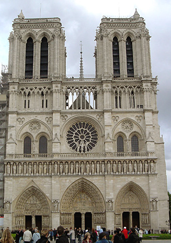 En horizontal, les trois étages de la Trinité comme de la scholastique (thèse, antithèse, synthèse) soumettent le libre orgueil de l’homme et son aspiration vers le ciel (les tours) à la médiation du nouveau testament (les porches) par Marie, cette intermédiaire humaine qui est « la plus près de Dieu parce qu’elle est la plus près des hommes » (Péguy). Au-dessus d’elle il n’y a que l’air et le vent, la grâce des balustrades ouvertes et les bourdons, dont cet « Emmanuel » de 500 tonnes dont la voix grave s’entend sur tout Paris. Il a grondé le soir de la tuerie islamique du Bataclan.