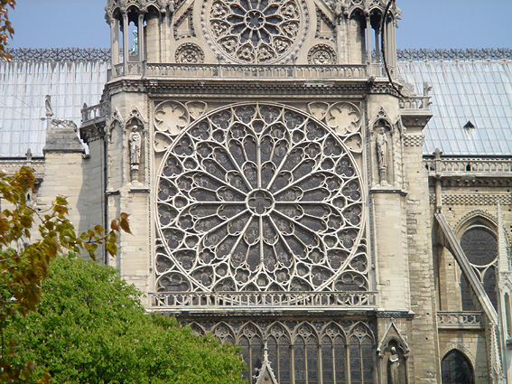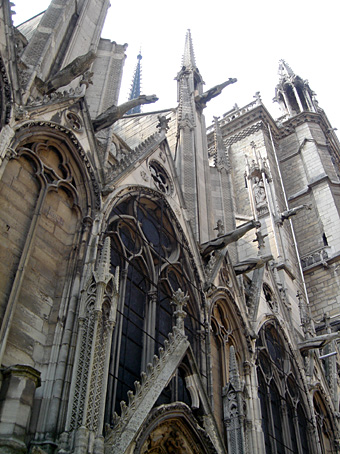 La façade nord est sombre et froide, coincée par l’étroite rue du Cloître Notre-Dame. Elle est toute hérissée de contreforts qui dardent leurs gargouilles monstrueuses. L’ennemi est bien l’obscurité, le gel, l’obscurantisme. La barbarie vient de ces endroits sombres d’où ressurgissent toutes les terreurs, les non-dits, l’informulé. Le retour vers le parvis est un soulagement. Toute religion, en nos pays tempérés, semble liée d’une façon ou d’une autre au soleil : à sa chaleur qui apaise, à ses facultés germinatives, à sa lumière qui chasse les fantômes.