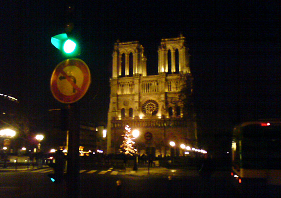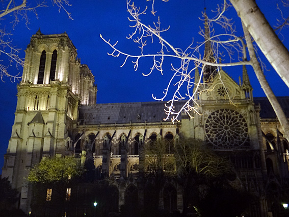 La cathédrale par le quai Saint-Michel surgit au-dessus des éventaires des bouquinistes comme une élévation de la culture, une sorte de temple qui justifie le savoir et la philosophie. Sa façade ouest fait face au soleil de l’après-midi. Elle est carrée, claire, apollinienne. Elle est force sereine, même la nuit. Sa façade est un visage : ses deux yeux sont les tours de 69 m de haut, son nez la rosace de la Vierge, son sourire les trois portails en demi-lune comme des dents. Elle présente sa puissance aux vents venus du large comme aux Vikings et autres ennemis venus par la Seine. Sur son île, elle trône comme la Foi, le Savoir et la Sagesse. Elle est la France éternelle dont l’esprit survit sous d’autres aspects.