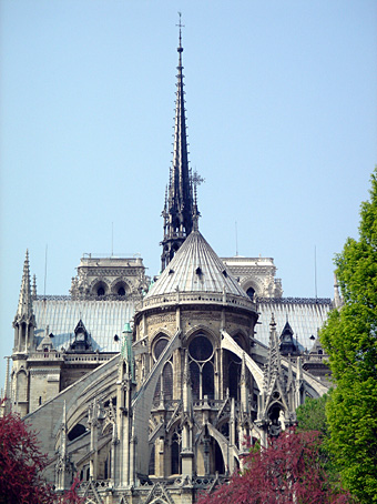 Depuis son parvis sont calculées les distances de tous les lieux du pays. Le point zéro des routes est ici, sur l’île où vogue Notre-Dame comme une nef renversée. Car cette église est un vaisseau échoué, ses deux tours comme un château arrière, sa flèche (aujourd’hui détruite) comme un beaupré haubané d’arches fines, tendant les mâts de sa toiture. Elle vogue à la rencontre du soleil et de Jérusalem, lieu de la naissance du Christ. Ce vaisseau de ligne est la foi qui passe et qui protège.