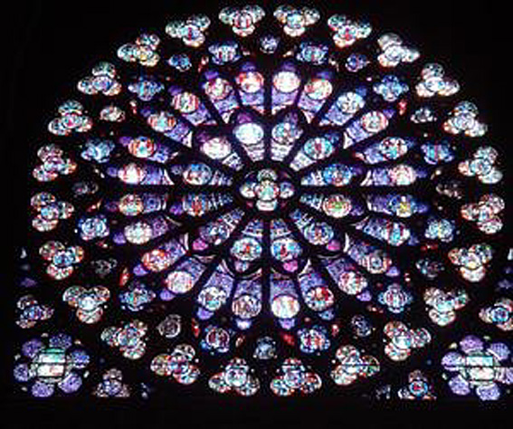 La rose nord est légèrement inclinée, les verres à dominante violette montrent de très haut des scènes de l’ancien Testament. Le violet est signe de l’attente du Messie.