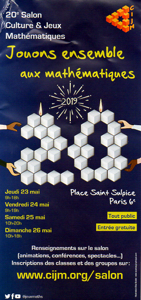 Dès le jeudi 23 mai à 9 heures, et jusqu’au dimanche 26 mai à 18 heures, se tiendra au cœur de Paris le 20e salon Culture et jeux mathématiques. Il aura lieu place Saint-Sulpice dans le sixième arrondissement. Ce salon est parrainé cette année par Jean-Marie De Koninck, mathématicien québécois reconnu pour ses travaux en théorie des nombres.