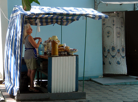 Notre petit-déjeuner est bourratif mais local, composé principalement de crêpes fourrées de fromage caillé. La patronne reprend son récit d’hier soir, traduit en simultané par Natacha. Elle a été déportée par Staline à l’âge de trois ans en 1944, direction l’Ouzbékistan où elle a grandi, exilée. Elle y est devenue professeur de chimie, s’y est mariée, a eu deux fils à dix ans d’intervalle. En 1989 après autorisation, elle et son mari ont vendu leur maison ouzbek, pas très cher, pour revenir en Crimée. Les Tatars de Crimée se tournent volontiers vers Simféropol où ils trouvent depuis 1994 une université tatare et où ils peuvent avoir accès au Medjlis central (le Parlement). Ils préfèrent éviter Sébastopol, principalement peuplée de Russes, plus nombreux que dans les autres régions de la péninsule et avec lesquels les tensions sont encore très fortes.