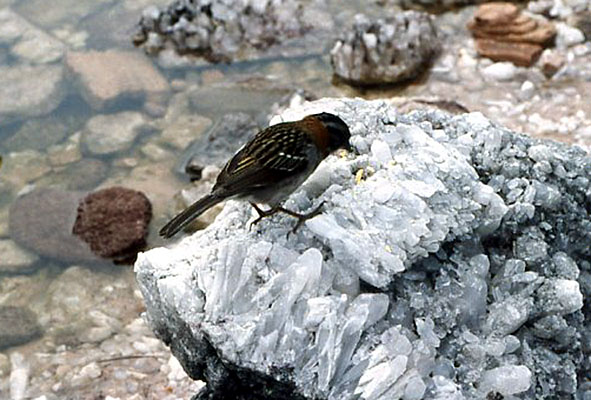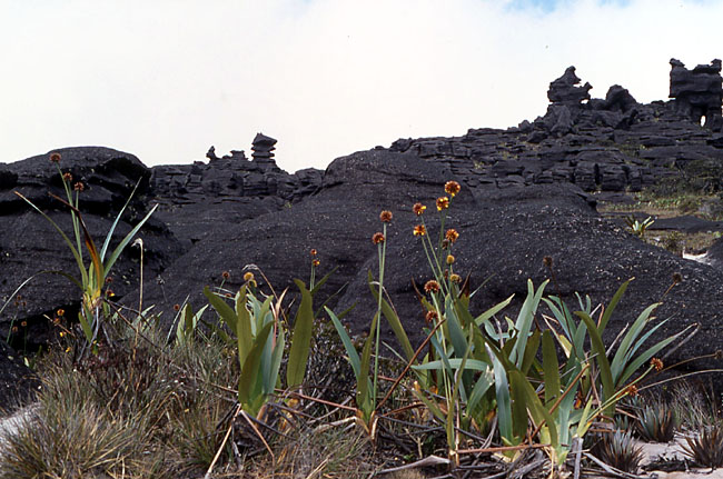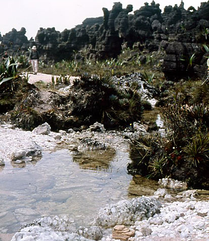 Quand le soleil donne enfin, il fait chaud très vite. Le sac s’alourdit de la veste. Nous pénétrons dans une petite vallée bordée de rochers noirs sculptés de formes étranges, c’est « la vallée des cristaux », découverte par le Dr Brewer-Carias en 1976. Dans le lit du ruisseau qui s’écoule lentement sur la faible pente, affleurent des plaques de cristaux de roche. Ils ne sont pas très purs, plutôt d’un blanc laiteux, mais d’une grosseur appréciable. Ils ont cristallisé en biseaux et leur pointe est assez dure pour rayer le verre et l’acier. De petits moineaux ont appris que, lorsqu’il y a des hommes, il y a des miettes. Aussi viennent-ils tout près de nous. Il suffit de ne pas bouger et ils tournent en sautillant avant de s’approcher jusqu’au ras de la main. Ils sont mignons et pas sauvages, de vrais gamins du Roraïma.