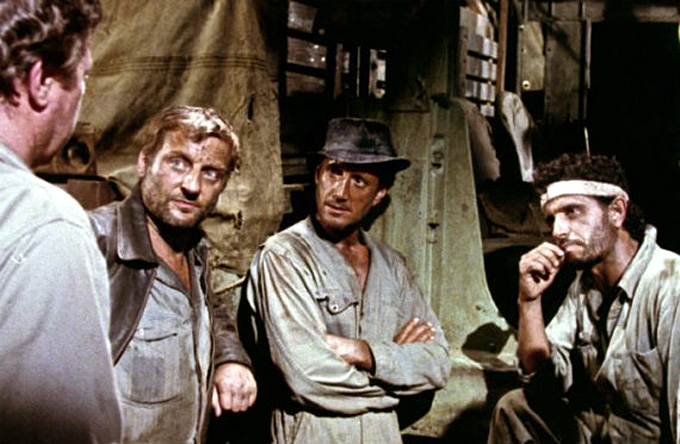 C’est alors un périple angoissant qui commence à travers la jungle. Aucun des chauffeurs ne se connait mais aucun n’a le choix. La police – corrompue – menace de récuser les faux papiers grossiers (un soi-disant natif du pays qui ne parle même pas espagnol !), les vengeurs mafieux du casse de l’église menacent de débarquer à tout moment, le tueur a encore tué un chauffeur pressenti pour prendre sa place. Chacun doit surtout travailler pour payer son passage vers ailleurs. Les camions sont des débris antiques, rafistolés avec les pièces des épaves alentour ; l’un d’eux a une mâchoire de squale avec des écailles sur le capot pour faire brute ! La dynamite dégradée est calée dans les bennes avec du sable pour éviter les chocs, mais la pluie battante et les chemins à peine empierrés mettent à rude épreuve les talents des chauffeurs. Un Indien à demi sauvage joue à courir nu devant le camion qui avance sans à-coup, menaçant un moment de le faire caler – donc exploser ; faudra-t-il l’écraser sans vergogne pour remplir « la mission » pour la multinationale ? Les ponts de bois ou de traverses sur câbles sont des cauchemars, la séquence de 12 mn si prenante a demandé 3 mois de tournage en raison de la lumière, la pluie battante a été reconstituée par des pompes et des ventilateurs. Quant à l’itinéraire, il est vaguement indiqué sur une carte à grande échelle mais la végétation luxuriante a repris ses droits et les routes sont à peine tracées.