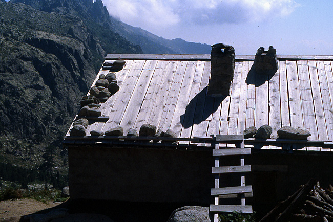 A Casamozza, attente encore du train du soir près d’un immeuble à 100 m de la gare. Notre occupation consiste en lecture, en déjeuner, en sieste, en discussion. Expérience faite, nous pensons Eric et moi qu’il vaut mieux suivre le GR 20 du sud au nord plutôt que le nord-sud préconisé dans le topo-guide. Le randonneur peut ainsi commencer plus doucement, s’élevant lentement dans le paysage jusque vers les montagnes centrales, et adapter son effort. Le ravitaillement est également mieux assuré, ce qui permet des sacs moins lourds au départ. Ce n’est qu’une fois entraîné par une bonne semaine de marche que commencent les difficultés, mais elles apparaissent alors plus faciles.