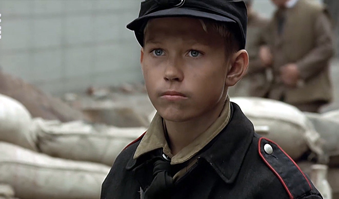 Après ses ordres aberrants et sans aucune « pitié » (mot judéo-chrétien qu’il avait en horreur), Adolf Hitler a fini par disparaître volontairement, sachant que tout est foutu. Dès lors, lourde ironie allemande, tout le monde a recommencé à fumer dans le bunker. Mais ce ne fut qu’une vingtaine d’heures seulement avant que les Russes ne débarquent à la chancellerie. Il a ordonné à son aide de camp Otto Günsche (Götz Otto), de la 1ère division SS Leibstandarte Adolf Hitler, de brûler son corps et celui d’Eva Hitler née Braun à l’essence, à l’orée du tunnel d’entrée. Le colonel médecin SS Ernst-Günther Schenck (Christian Berkel) croise des commandos SS dans la ville en flammes qui n’ont que ça à faire d’abattre des civils pour « atteinte au moral de l’armée » et des Volkssturm mal armés qui n’avaient d’autre choix que de se rendre ou de mourir. Même Peter (Donevan Gunia) le petit fana mili de 12 ans, Hitlerjugend blond bien pris dans son uniforme noir, se rend compte de la stupidité de la fidélité à tout prix. Il a été inspiré par le vrai Alfred Czech né en 1932 et mort en 2011, le plus jeune garçon à avoir été décoré de la Croix de fer devant le bunker par Hitler en personne pour avoir dégommé deux chars soviétiques au Panzerfaust. Les armes de poing ne peuvent guère contre une armée en marche et ses amis et amies se font tuer bêtement – pour rien. Même son père, qui voulait l’empêcher de se battre, a fini pendu au dernier moment par des voisins jaloux ou fanatisés.